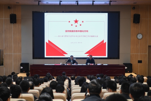 本网讯 为进一步深刻领会习近平总书记关于宗教工作的重要论述,12月11日上午,我校在三江校区启航会议中心2号会议厅召开党委理论学习中心组(扩大)学习会暨“干部培训大讲堂”之宗教工作专题培训。江西省民族宗教事务局党组成员、副局长李新华受邀做题为《坚持我国宗教中国化方向》的专题辅导报告。全体在家校领导、党委常委,学校机关中层干部,各学院(学部)党委书记、副书记、统战委员,全体辅导员、组织员参加培训。培训会由校党委书记杨斌主持。