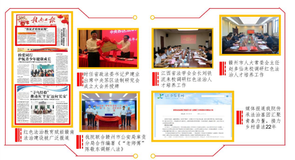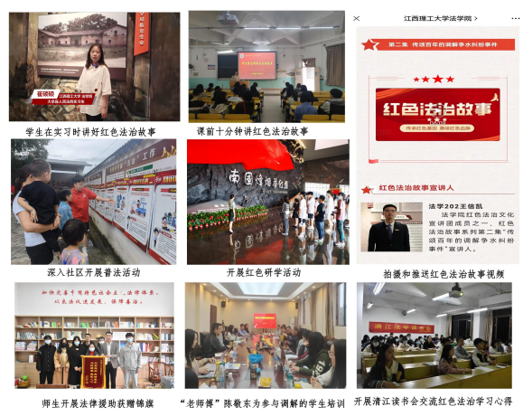 法学院红色法治教育成效显著。涌现全省五四红旗团支部、全省活力团支部等先进集体;红色法治志愿服务队20余年来,年均服务2000余人次,获第六届中国青年志愿服务项目大赛铜奖;学生红色法治作品两次获得江西省“红色走读”一等奖;制作《听大学生讲红色法治故事》栏目浏览量过万;学生在苏区法治论坛等各类征文中发表红色法治论文百余篇;建成的中央苏区法制建设展览馆成为江西省法治宣传教育基地,接受校内外各界人士超5000人次参观学习;师生研习平台“中央苏区法制研究基地”获批为江西省哲学社会科学重点研究基地;法学专业获批国家级一流专业建设点。