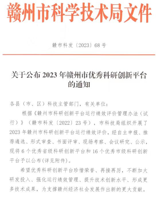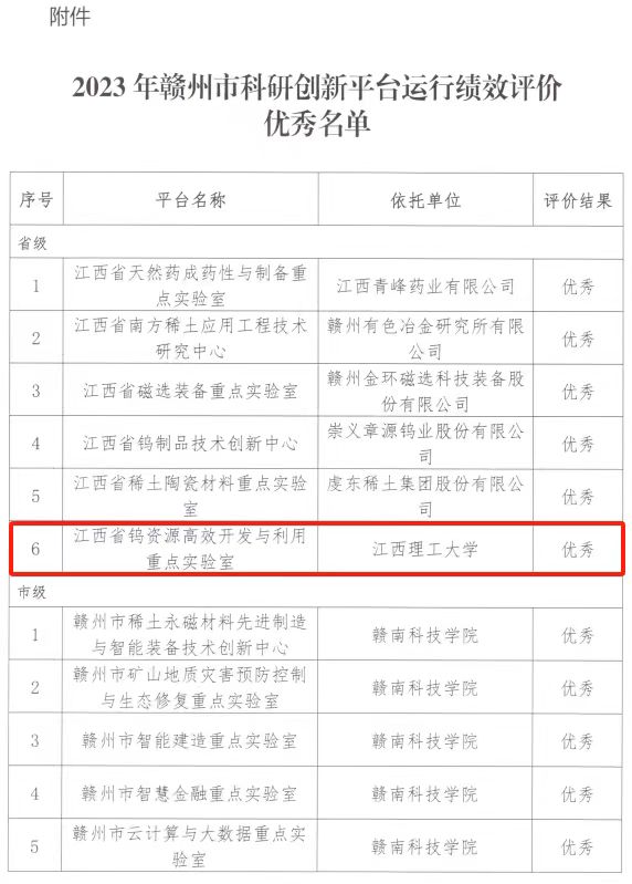 本网讯  近日,赣州市科学技术局公布了《关于2023年赣州市优秀科研创新平台的通知》(赣市科发〔2023〕68号),我校“江西省钨资源高效开发与利用重点实验室”被评为省级优秀科研创新平台,“绿色冶金与过程强化工程技术研究中心”被评为市级优秀科研创新平台。