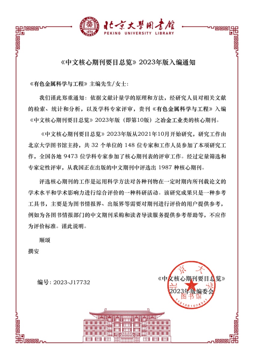 本网讯 近日,北京大学图书馆主编的《中文核心期刊要目总览》(2023年版)即第10版正式发布,我校主办的《有色金属科学与工程》再次入编该要目总览2023年版即第10版冶金工业类的核心期刊。自2010年10月学校提出中文核心期刊培育计划以来,该刊在学校党政的高度重视和支持下,在期刊编委、审稿专家、作者和编辑等人的持续努力下,不忘办刊初心,牢记目标使命,开拓实干、久久为功,办刊成效再次得到广大专家学者和期刊业界认可。