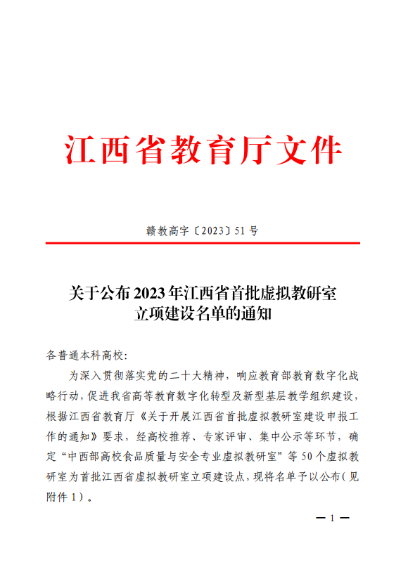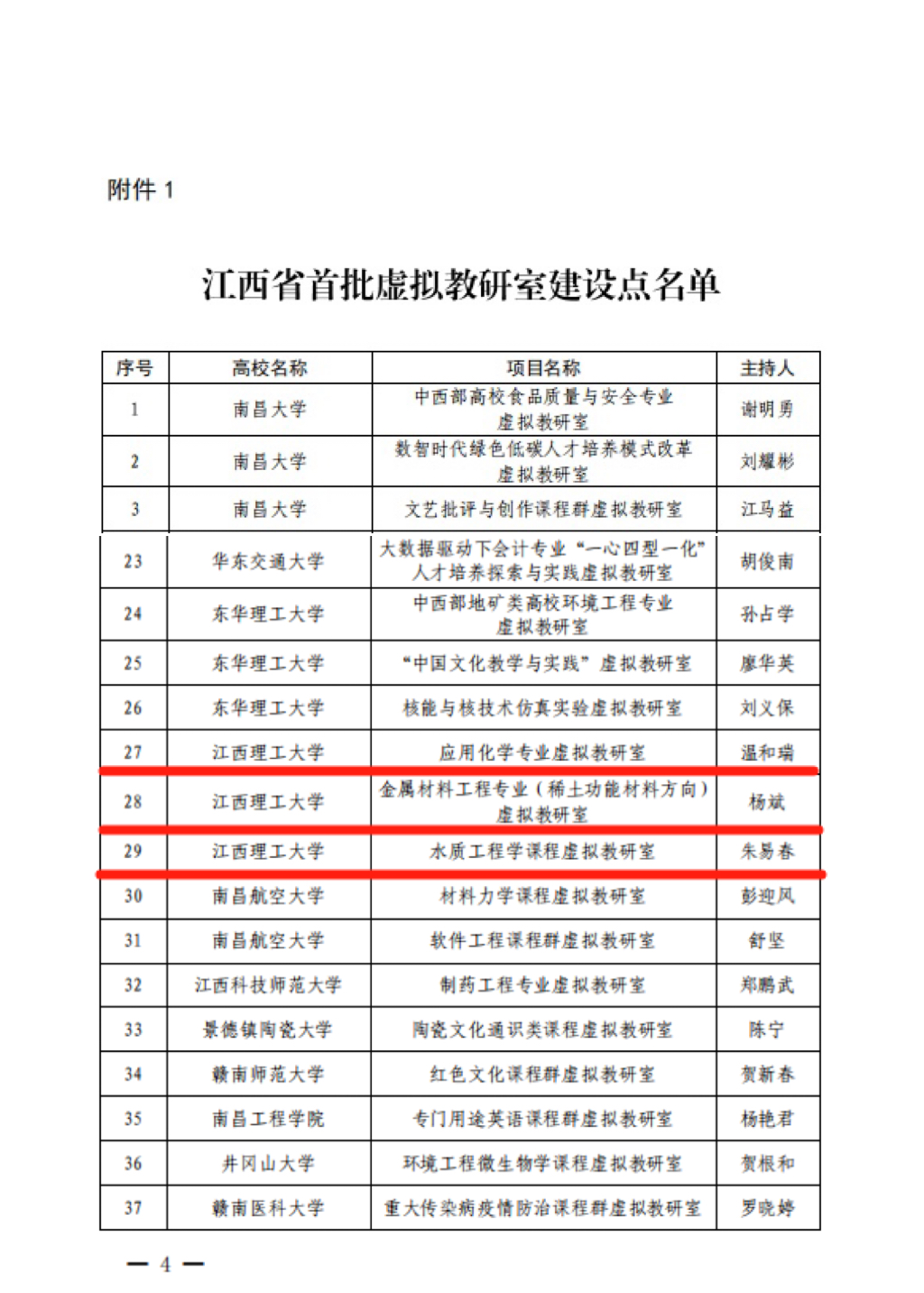 本网讯  近日,江西省教育厅下发了《关于公布2023年江西省首批虚拟教研室立项建设名单的通知》(赣教高字〔2023〕51 号),我校申报的应用化学专业虚拟教研室、金属材料工程专业(稀土功能材料方向)虚拟教研室、水质工程学课程虚拟教研室获批确立为首批江西省虚拟教研室立项建设点。