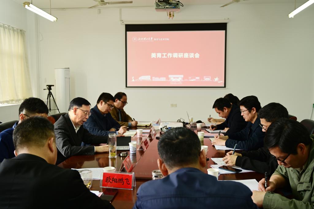 会上,体育与艺术学院副院长黄丽娜作美育工作汇报,就我校美育工作现阶段教育管理、师资配备、课程体系、评价体系和艺术氛围等方面存在的问题进行了介绍,并提出了相应的改进措施。体育与艺术学院院长欧阳鹏飞对落实教育部印发的《高等学校公共艺术课程指导纲要》等文件进行了分析解读,并就学校美育、体育工作整体规划作了说明。
