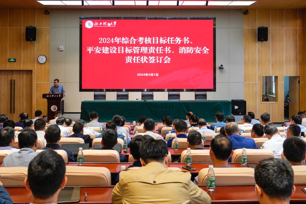本网讯 4月1日上午,我校2024年度综合考核目标任务书、平安建设目标管理任务书、消防安全责任状签订会在三江校区启航会议中心1号会议厅举行。全体在家校领导、党委常委出席,全体中层正职和主持(或牵头)工作的中层副职参加会议。签订会由校党委常委、副校长黄志繁主持。