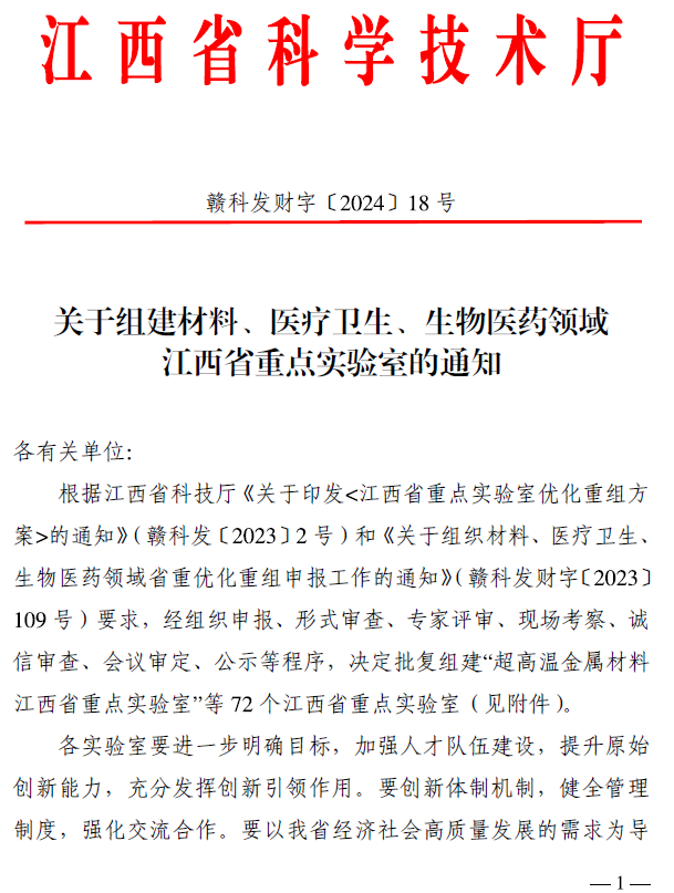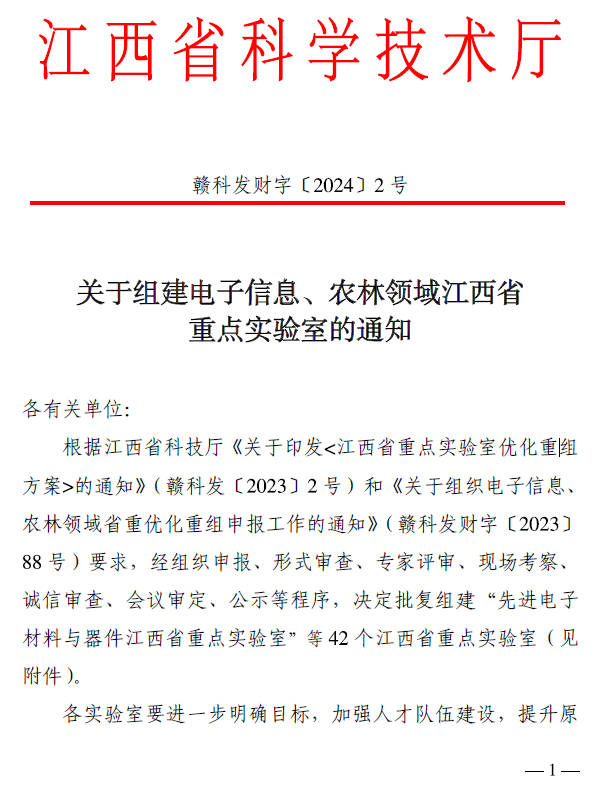 本网讯  近日,江西省科技厅下发了《关于组建电子信息、农林领域江西省重点实验室的通知》(赣科发财字〔2024〕2号)和《关于组建材料、医疗卫生、生物医药领域江西省重点实验室的通知》(赣科发财字〔2024〕18号),我校申报的多维智能感知与控制江西省重点实验室、功能晶态材料化学江西省重点实验室、金属磁性材料及器件江西省重点实验室、高性能钢铁合金材料江西省重点实验室获批组建。