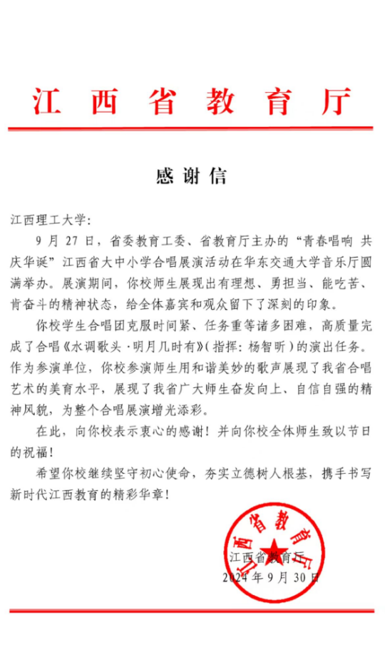 本网讯  9月30日,江西省教育厅向学校发来感谢信,信中对我校八角之声合唱团以“有理想、勇担当、能吃苦、肯奋斗的精神状态”高水平、高质量完成了混声合唱《水调歌头·明月几时有》的展演任务给予了高度评价,全文如下: