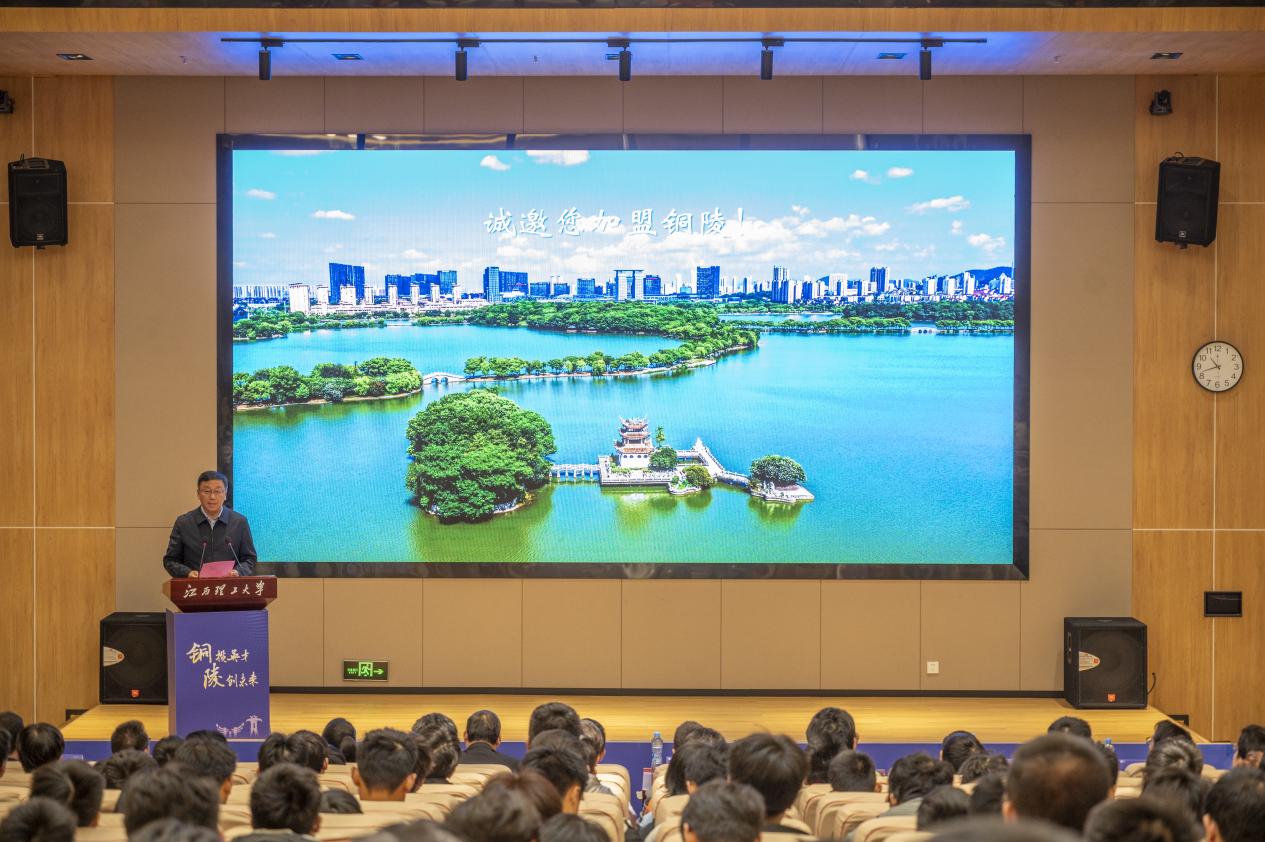 宣讲会上,唐云志介绍了我校的基本概况。他指出,随着学校和铜陵市的人才与就业合作不断深化,越来越多应届毕业生签约铜陵市相关企业,期待未来校地双方能在人才培养、就业资源开发、产学研用深度融合等方面开展更深入、长期的合作,携手为全面推进中国式现代化贡献新的更大力量。