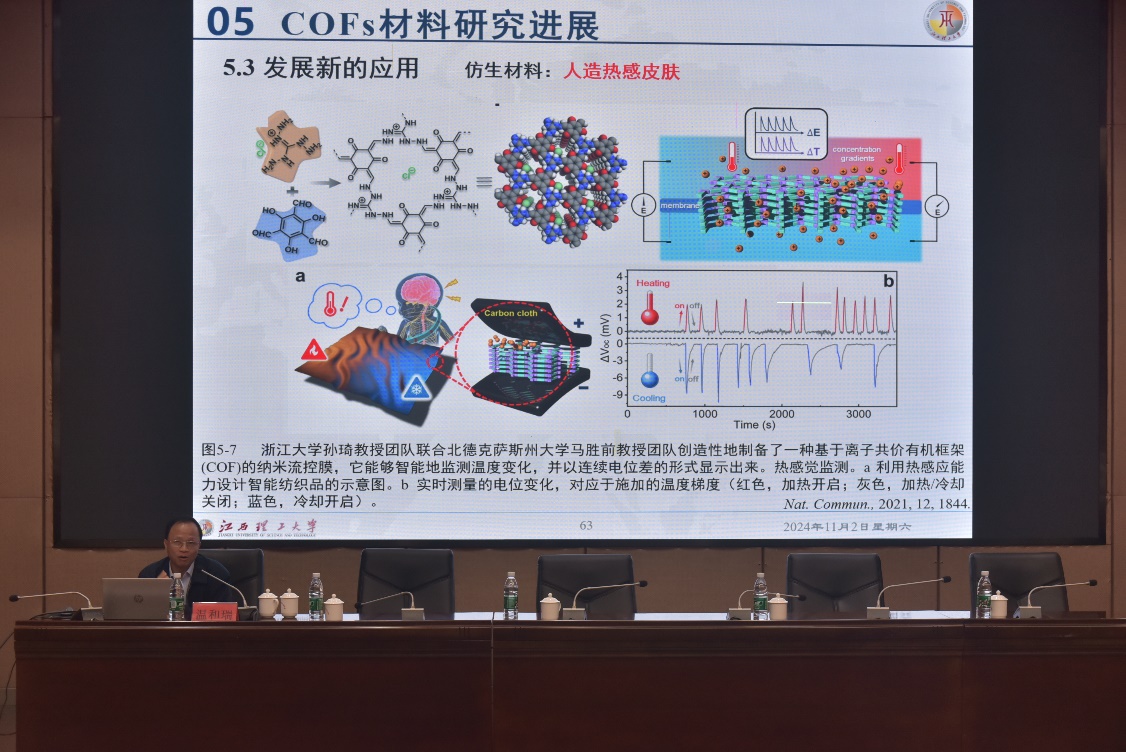 开班仪式结束后,我校原校长温和瑞首先作了《功能高分子新材料的设计合成与应用-共价有机框架(COFs)材料》的专题报告。报告从共价有机框架材料出发,详细阐述了共价有机框架材料的最新发展和未来技术前景,如拓宽COFs材料应用场景,用于新能源电池、储氢、人造传感皮肤等前沿领域,同时他也强调了COFs材料在未来材料发展领域中所占有的重要地位。