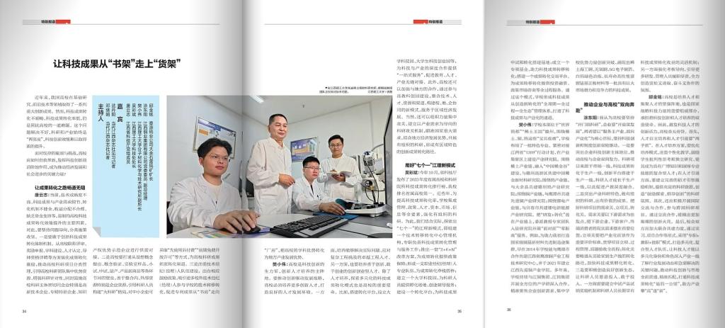 吴彩斌:今年10月,省科技厅发布了2023年度省属高校和科研院所科技成果转化排行榜,我校排名省属高校第一 。近些年,为提高科技成果转化率,学校集成管理、政策、人才、资本、市场、信息等全要素,强化有组织的科研。为此,我们结合实际情况,探索出“七个一 ”的江理新模式,即组建一个技术转移转化中心管理机构,专职负责科技成果转化管理与服务工作;推出一套“2+6+N ”改革方案,为成果转化提供政策保障;形成一支职业经纪人专业队伍,为成果转化牵线搭桥;建立一个大学科技园,为科研人员提供孵化场地、创业辅导服务;建设一个转化平台,为科技成果中试和转化搭建基地;成立一个专项基金,助力科技成果转移转化;搭建一个成果转化交易平台,为成果转移转化提供投资融资、政策市场咨询等全过程服务。通过这个模式,学校形成科技成果从创造到转化的“全周期—全过程—全生态 ”管理体系,打通科技成果与产业化的通道。