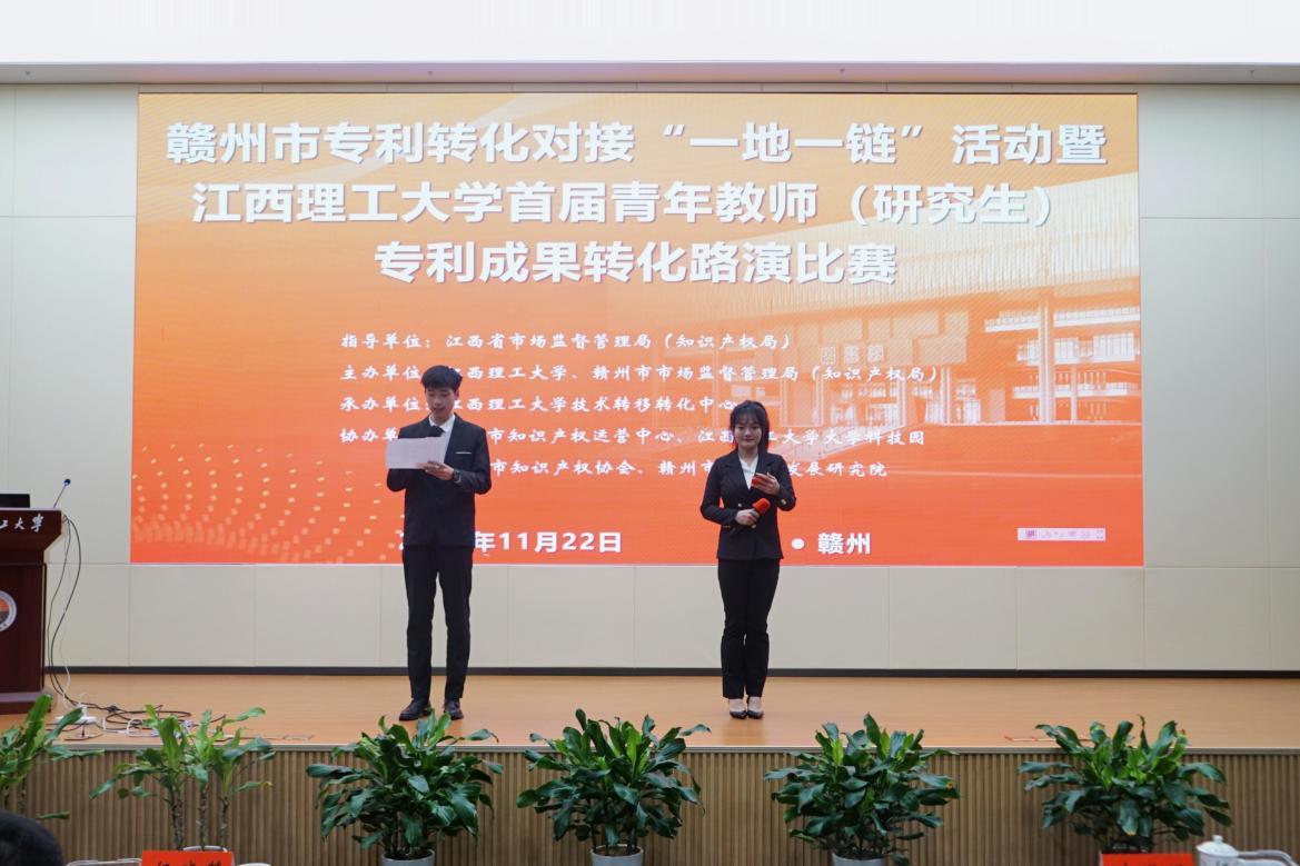 本网讯 11月22日,由江西省市场监督管理局(知识产权局)指导,我校和赣州市市场监督管理局(知识产权局)主办,我校技术转移转化中心承办的赣州市专利转化对接“一地一链”活动暨“安博站官网登录入口,_安博(中国)首届青年教师(研究生)专利成果转化路演比赛”在三江校区圆满落幕。校党委常委、副校长董冰岩,赣州市市场监督管理局二级调研员郭素华出席大赛开幕式并致辞。本次比赛共吸引了包括我校师生、赣州市部分高校、科研院所、知识产权服务机构、企业代表等100余人参加。