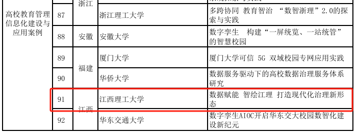 本网讯  近日,教育部公布了2024年数字化赋能教育管理信息化建设与应用典型案例名单,我校《数据赋能 智绘江理 打造现代化治理新形态》成功入选,全省仅2所高校获此殊荣。这标志着学校在利用数据驱动教育管理方面取得了显著成就,为构建现代化治理新模式提供了生动的实践范例。