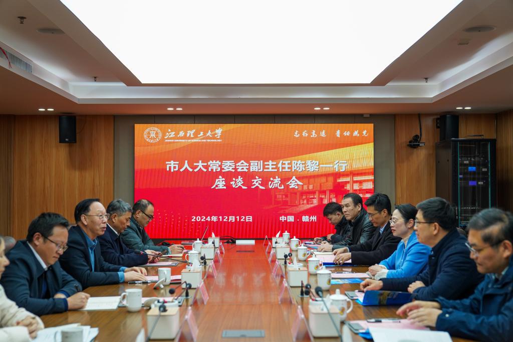 本网讯  12月12日上午,赣州市人大常委会副主任陈黎一行来校调研座谈。校党委书记杨斌,校党委常委、副校长龚姚腾出席座谈会,相关部门主要负责人参加会议。会议由龚姚腾主持。