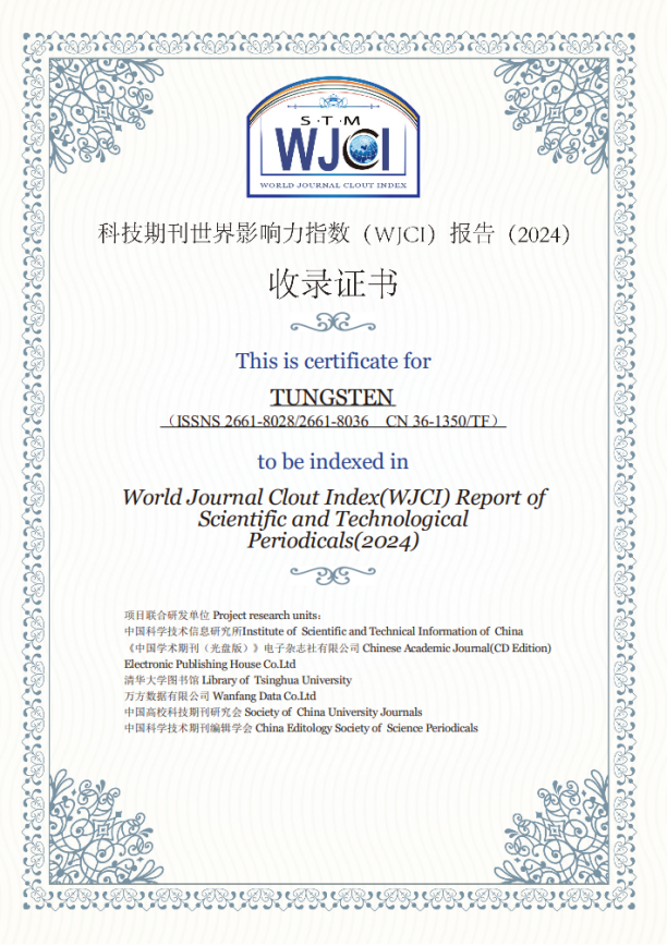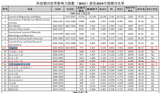 本网讯 近日,《科技期刊世界影响力指数(WJCI)报告》(以下简称《WJCI报告》)及《中国学术期刊国际引证年报》集中发布,我校主办中英文期刊《钨科技(英文)》和《有色金属科学与工程》再度被《WJCI报告》收录,并在《WICI报告2024中国期刊名单》的冶金工程技术分类中分别位列Q1区和Q3区,全国近百本冶金工程技术类中英文期刊仅26本入选。此外,《钨科技(英文)》在《中国学术期刊国际引证年报》中被评选为“2024中国国际影响力优秀学术期刊”(简称TOP期刊),从7138种中国科技英文、科技中文、社科英文、社科中文学术期刊中脱颖而出。