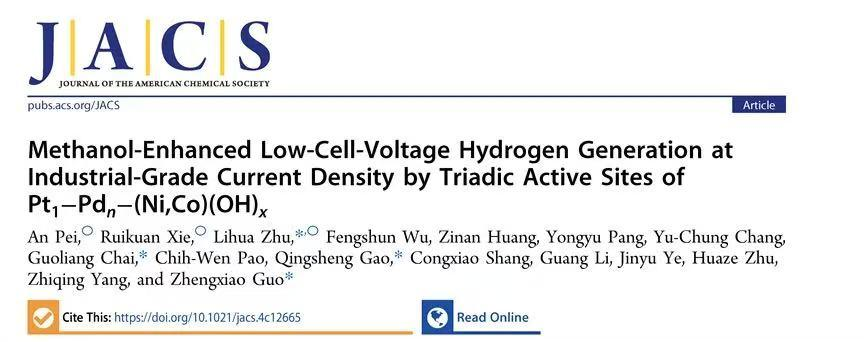 本网讯 近日,我校化学化工学院(功能晶态材料化学江西省重点实验室)朱丽华教授课题组在能源催化领域取得重要突破,成果在国际顶级期刊《Journal of the American Chemical Society》以“Methanol enhanced low-cell-voltage hydrogen generation at industrial-grade current density by triadic active sites of Pt1–Pdn–(Ni,Co)(OH)x”为题发表论文,我校为论文第一完成单位,我校2018级硕士生裴安为论文第一作者,中国科学院福建物质结构研究所解瑞宽博士、我校朱丽华教授为论文共同一作,我校朱丽华教授、中国科学院福建物质结构研究所柴国良研究员、暨南大学高庆生教授、香港大学郭正晓教授为共同通讯作者。台湾同步辐射中心包志文博士、厦门大学叶进裕博士、广东佛山季华实验室杨志卿研究员等人也参与该工作。