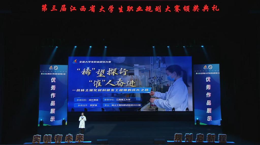 此外,稀土学院的廖梦琪作为高教组唯一代表,在大赛颁奖典礼上进行优秀作品展示,展现了我校学子的青春风采。
