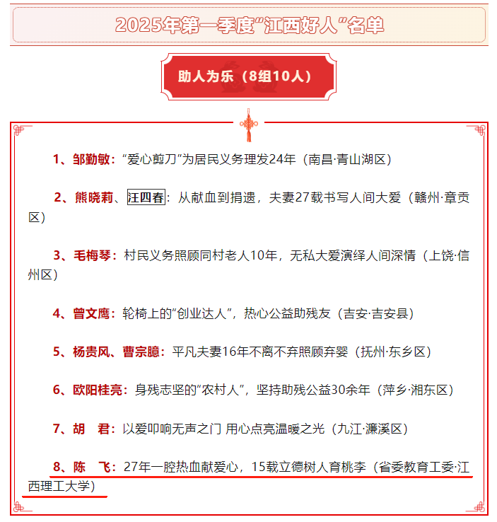 本网讯 近日,在江西省文明办向社会发布的2025年第一季度“江西好人榜”中,我校资源与环境工程学院副院长陈飞获评2025年度第一季度助人为乐类“江西好人”。