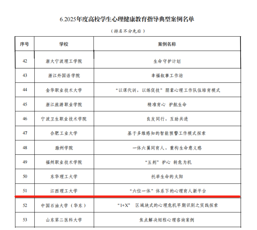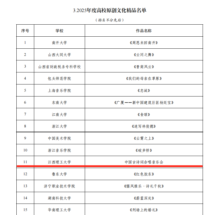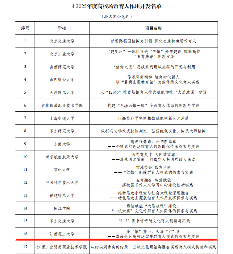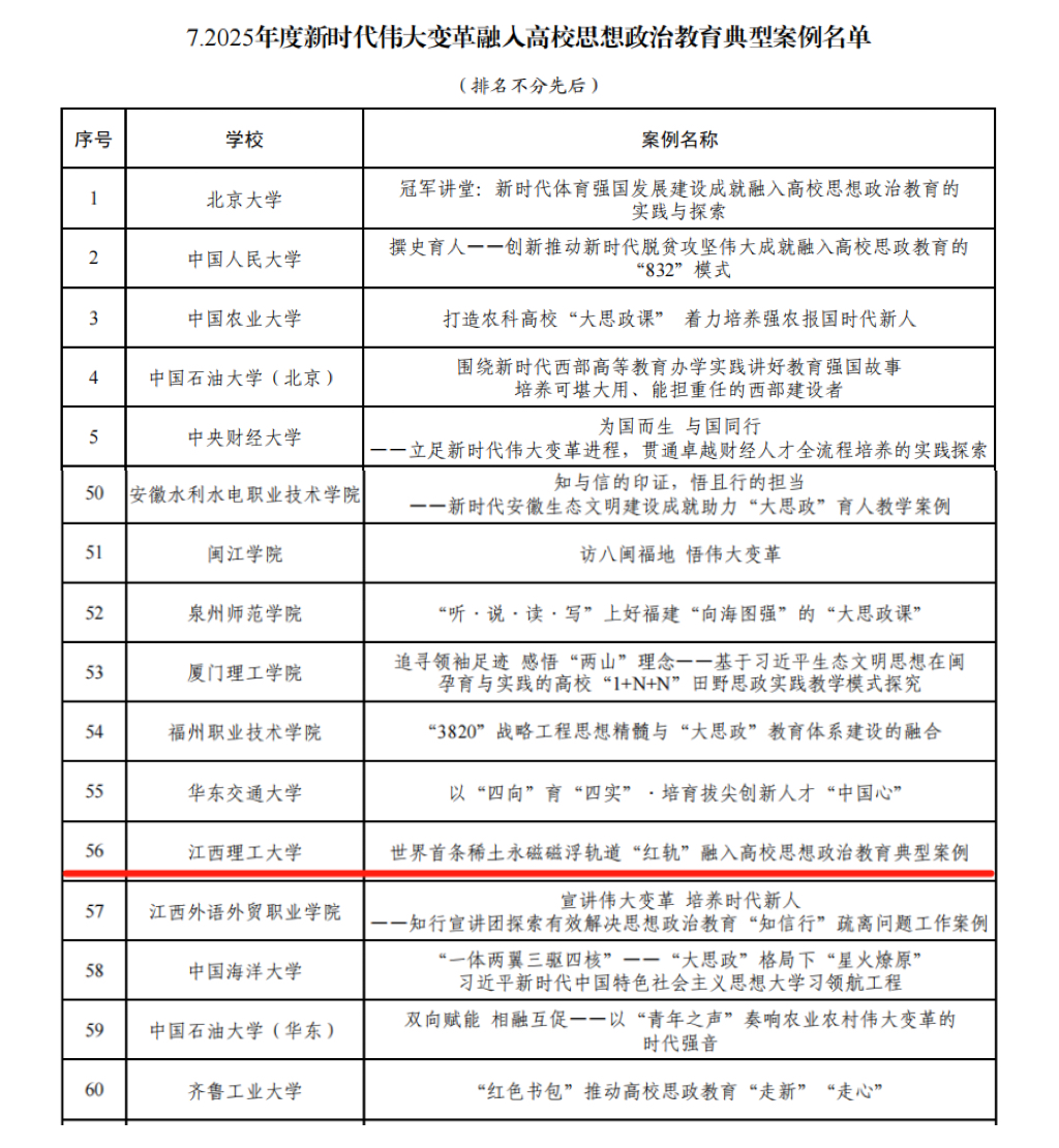 本网讯  近日,教育部公布了2025年度高校思想政治工作质量提升综合改革与精品建设项目遴选结果。我校共4个项目入选,其中,“中国古诗词合唱音乐会”项目入选2025年度高校原创文化精品,“多‘馆’齐下,大展‘红’图——革命老区高校场馆集群育人模式的探索与实践”入选2025年度高校场馆育人作用开发,“‘六位一体’体系下的心理育人新平台”入选2025年度高校学生心理健康教育指导典型案例,“世界首条稀土永磁磁浮轨道‘红轨’融入高校思想政治教育典型案例”入选2025年度新时代伟大变革融入高校思想政治教育典型案例,入选总数并列全省第一。