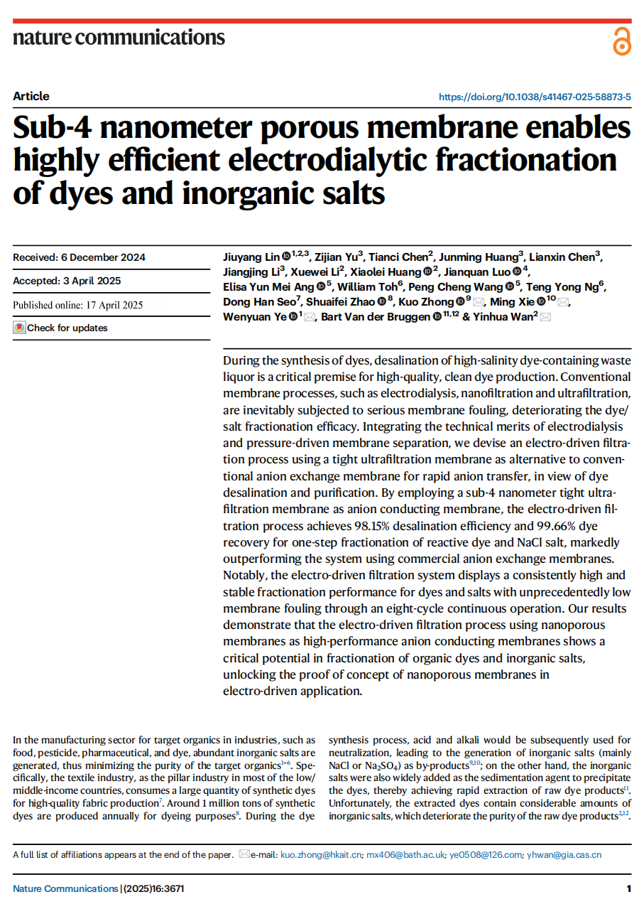 本网讯 近日,我校土木与测绘工程学院叶文媛教授团队以我校作为第一通讯单位,在《Nature》子刊《Nature Communications》上发表了题为“Sub-4 nanometer porous membrane enables highly efficient electrodialytic fractionation of dyes and inorganic salts”的研究成果。