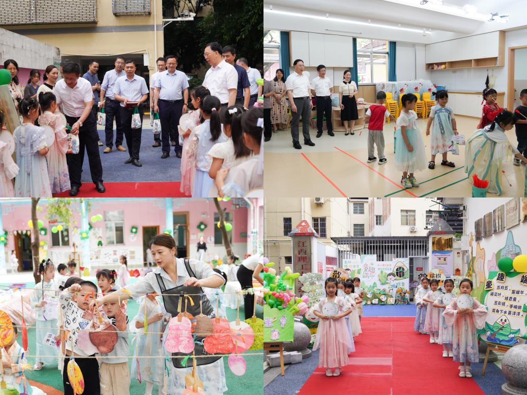 在章贡区第二实验幼儿园,徐志峰一行参观了旨在培养孩子大学梦想的文化墙及由儿童故事绘本转化而来的端午龙舟主题展;在园内组织的亲子游戏环节中,徐志峰与家长和孩子们亲切互动,现场欢声笑语不断,气氛十分热烈。在实地考察了幼儿园的校园环境、活动场地及各类硬件设施后,徐志峰对幼儿园在日常管理及安全防护等环节细致到位的工作表示高度认可,他希望全体教职工持续精进保育教育水平,以仁爱之心对待每一位孩子,用耐心、细心和匠心呵护孩子的童真与创造力。通过营造积极向上的园所文化,以温暖专业的形象成为孩子成长的引路人、家长信赖的合作伙伴,让幼儿园真正成为爱的港湾。
