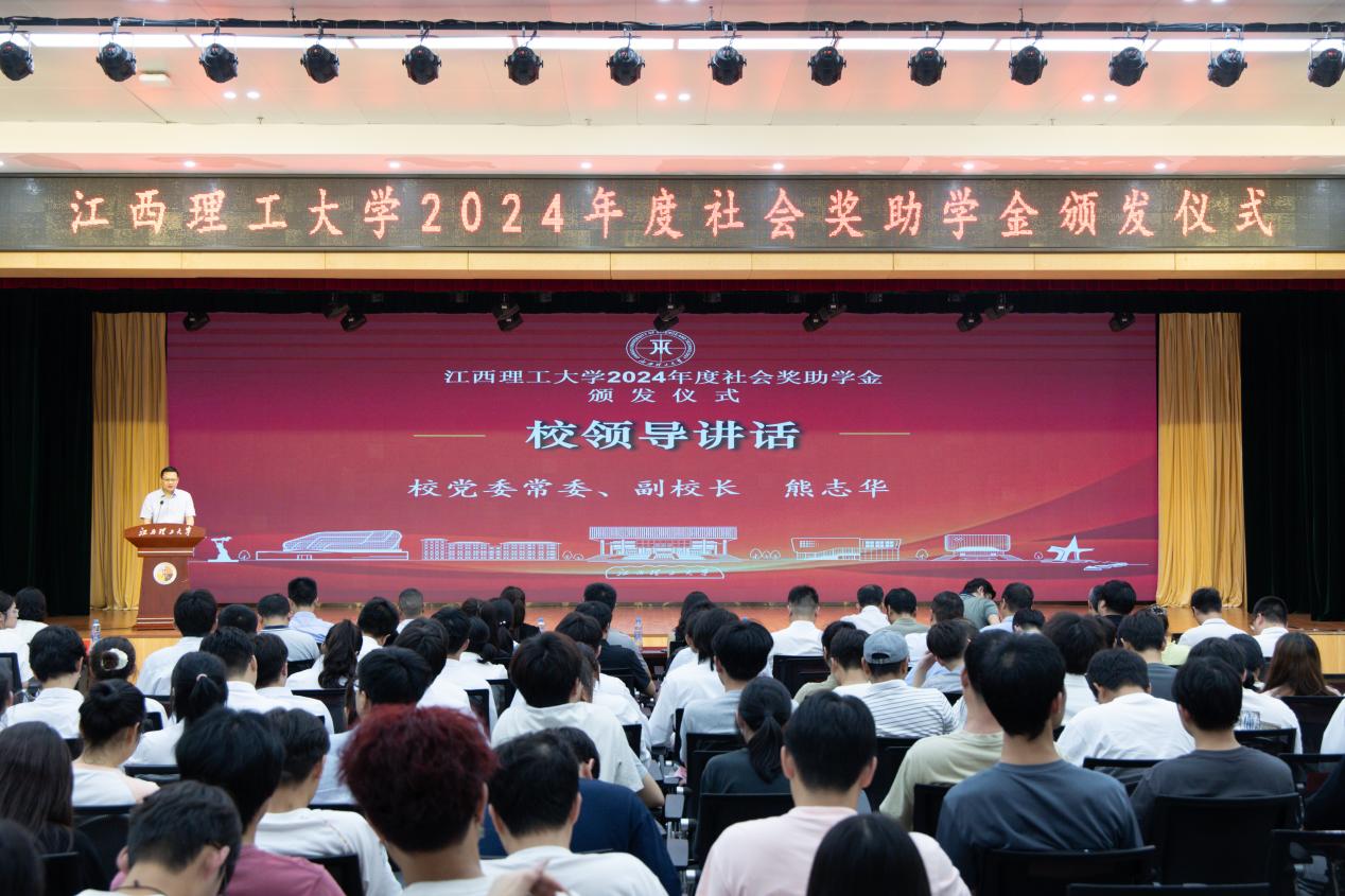 本网讯 6月5日,我校在三江校区三实楼多功能厅举行2024年度社会奖助学金集中颁发仪式。惠明慈善基金有限公司、金诚信矿业管理股份有限公司、江西金力永磁科技股份有限公司、共青城瑞钛管道科技有限公司、江西万年青水泥股份有限公司、赣州腾远钴业新材料股份有限公司、广盈控股集团有限公司代表,校党委常委、副校长熊志华出席,各学院、相关职能部门负责人及获得社会奖助学金的师生代表等200余人参加了相关活动。