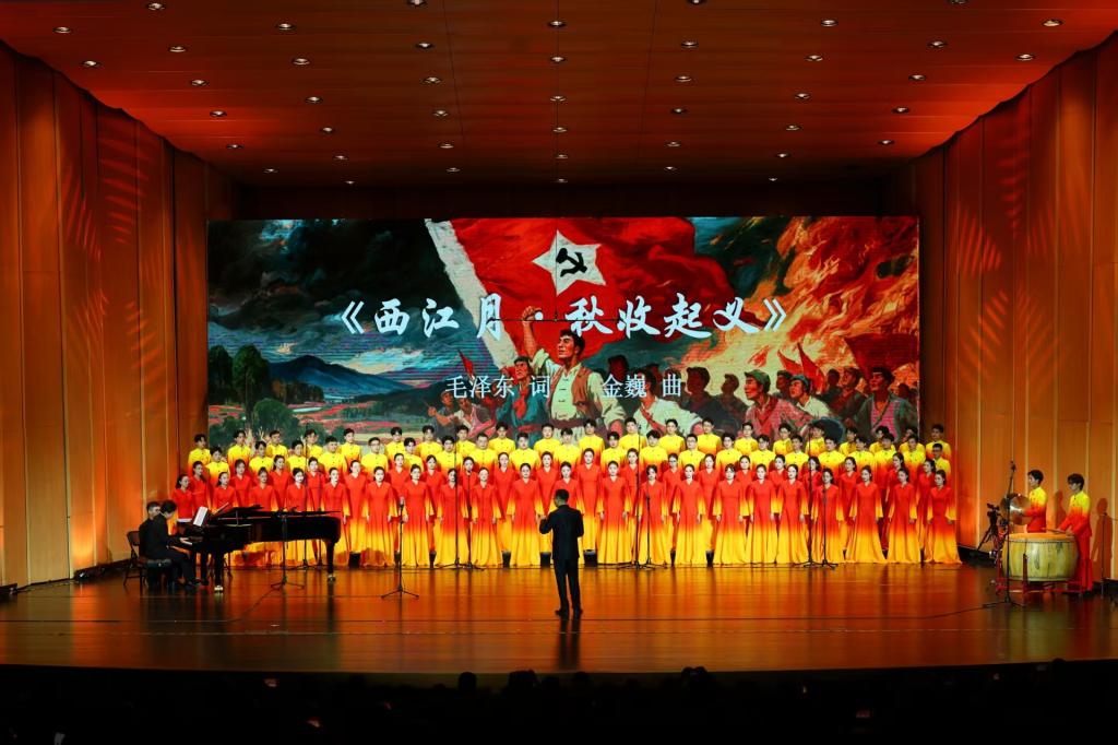 音乐会以毛泽东在江西创作或与江西紧密相关的经典诗词为重点,以历史事件时间为序编排。从《西江月・秋收起义》“军叫工农革命,旗号镰刀斧头”的激昂呐喊,到《沁园春・雪》“俱往矣,数风流人物,还看今朝”的哲思名句,中国革命在江西大地从星火燎原到走向胜利的征程如璀璨明珠般颗粒分明。八角之声合唱团以混声合唱、男声合唱、女声合唱、领唱与合唱等形式,让每一首承载着历史记忆的诗词在和声交织中焕发出独特的艺术魅力,生动勾勒出秋收起义号角、井冈山根据地创建、反“围剿”斗争等鲜活的历史场景,为观众刻画出一幅穿越时空的革命历史长卷。