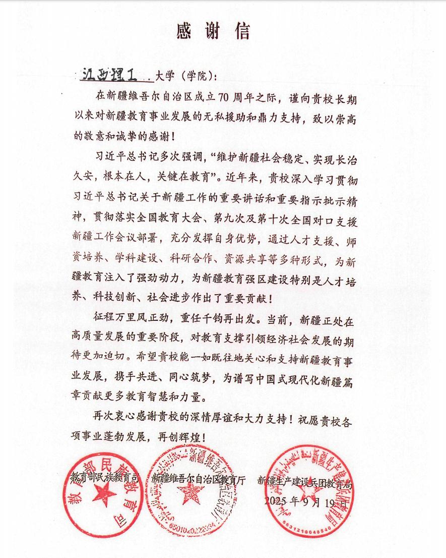本网讯 在新疆维吾尔自治区成立70周年之际,教育部民族教育司、新疆维吾尔自治区教育厅、新疆生产建设兵团教育局三家单位联合向学校发来感谢信,感谢我校长期以来对新疆教育事业发展的无私援助和鼎力支持,并对我校为新疆教育强区建设领域的贡献给予了高度评价。