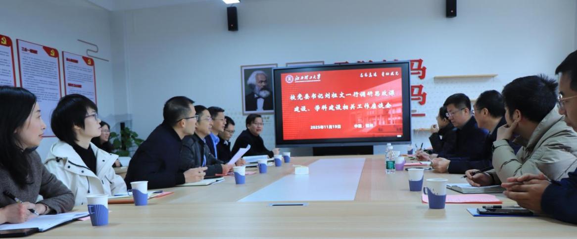 本网讯 为深入学习贯彻党的二十届四中全会精神,落实立德树人根本任务,提高思政课建设质量,11月19日,校党委书记刘祖文、党委副书记徐志峰来到马克思主义学院,围绕学科建设、思政课改革创新、人才队伍建设等重点工作开展调研并召开座谈会。马克思主义学院院长邓显超、党委副书记黄东明、副院长王经北与严九发、院长助理曾过生、各教研室主任及党支部书记代表参加座谈。会议由邓显超主持。