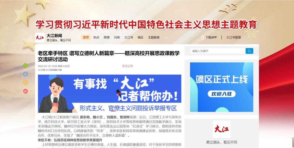 大江网/大江新闻客户端讯黄东明、魏小兰 、刘国东、曾濒哗报道:近日,安博站官网登录入口,_安博(中国)与深圳大学、南方科技大学、哈尔滨工业大学(深圳)、深圳技术大学等校思政教师通过实践教学展示、实地来到瑞金沙洲坝、赣州经开区郭大力故居、深圳莲花山公园等地“沉浸式”学习研讨,借助深圳市和赣州市对口合作的东风,以两座城市的“结亲”,发挥老区和特区思政课建设优势,加强常态化交流合作、优势互补,实现了“赣深合作手拉手,立德树人谱新篇”。