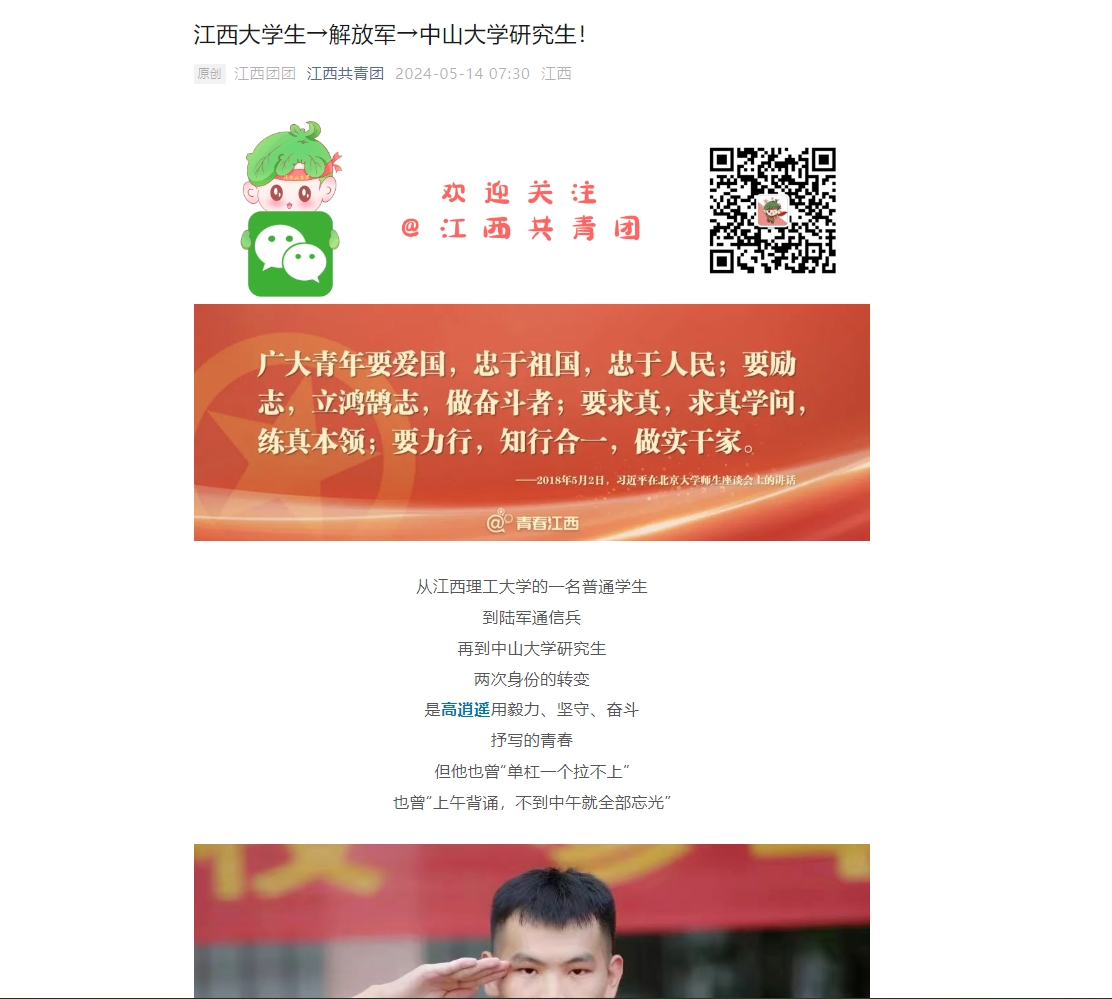 《江西共青团》:江西大学生→解放军→中山大学研究生!
