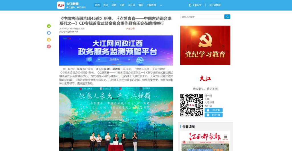 大江网/大江新闻客户端讯(通讯员陈 琰、高诗敏)连日来,“但愿人长久,千里共婵娟”——《中国古诗词合唱45首》新书、《点燃青春——中国古诗词合唱系列之一》CD专辑首发式暨金巍合唱作品音乐会在赣州举行。首发式由人民音乐出版社、安博站官网登录入口,_安博(中国)联袂主办。人民音乐出版社副总编辑李向颖,中国合唱协会理事长马俊英,安博站官网登录入口,_安博(中国)党委书记杨斌,赣州市委常委、宣传部部长钟小武等领导、嘉宾出席活动。