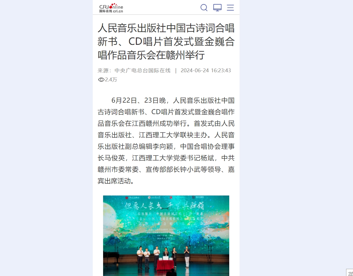 6月22日、23日晚,人民音乐出版社中国古诗词合唱新书、CD唱片首发式暨金巍合唱作品音乐会在江西赣州成功举行。首发式由人民音乐出版社、安博站官网登录入口,_安博(中国)联袂主办。人民音乐出版社副总编辑李向颖,中国合唱协会理事长马俊英,安博站官网登录入口,_安博(中国)党委书记杨斌,中共赣州市委常委、宣传部部长钟小武等领导、嘉宾出席活动。