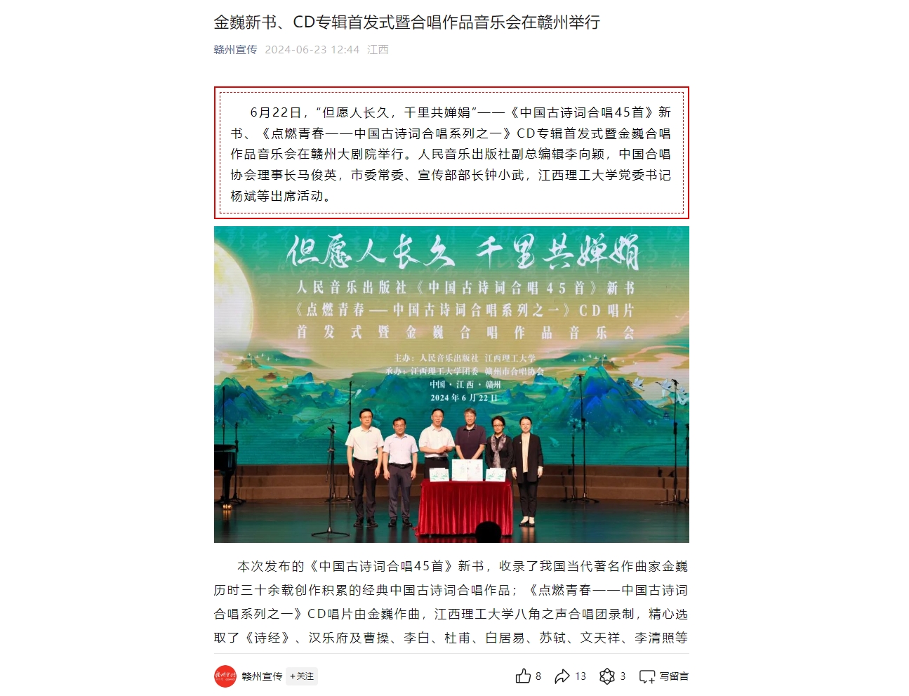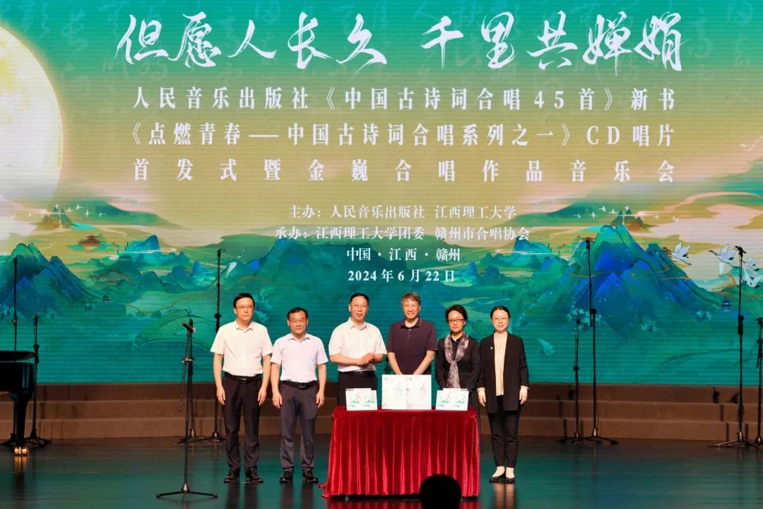 6月22日,“但愿人长久,千里共婵娟”——《中国古诗词合唱45首》新书、《点燃青春——中国古诗词合唱系列之一》CD专辑首发式暨金巍合唱作品音乐会在赣州大剧院举行。人民音乐出版社副总编辑李向颖,中国合唱协会理事长马俊英,市委常委、宣传部部长钟小武,安博站官网登录入口,_安博(中国)党委书记杨斌等出席活动。