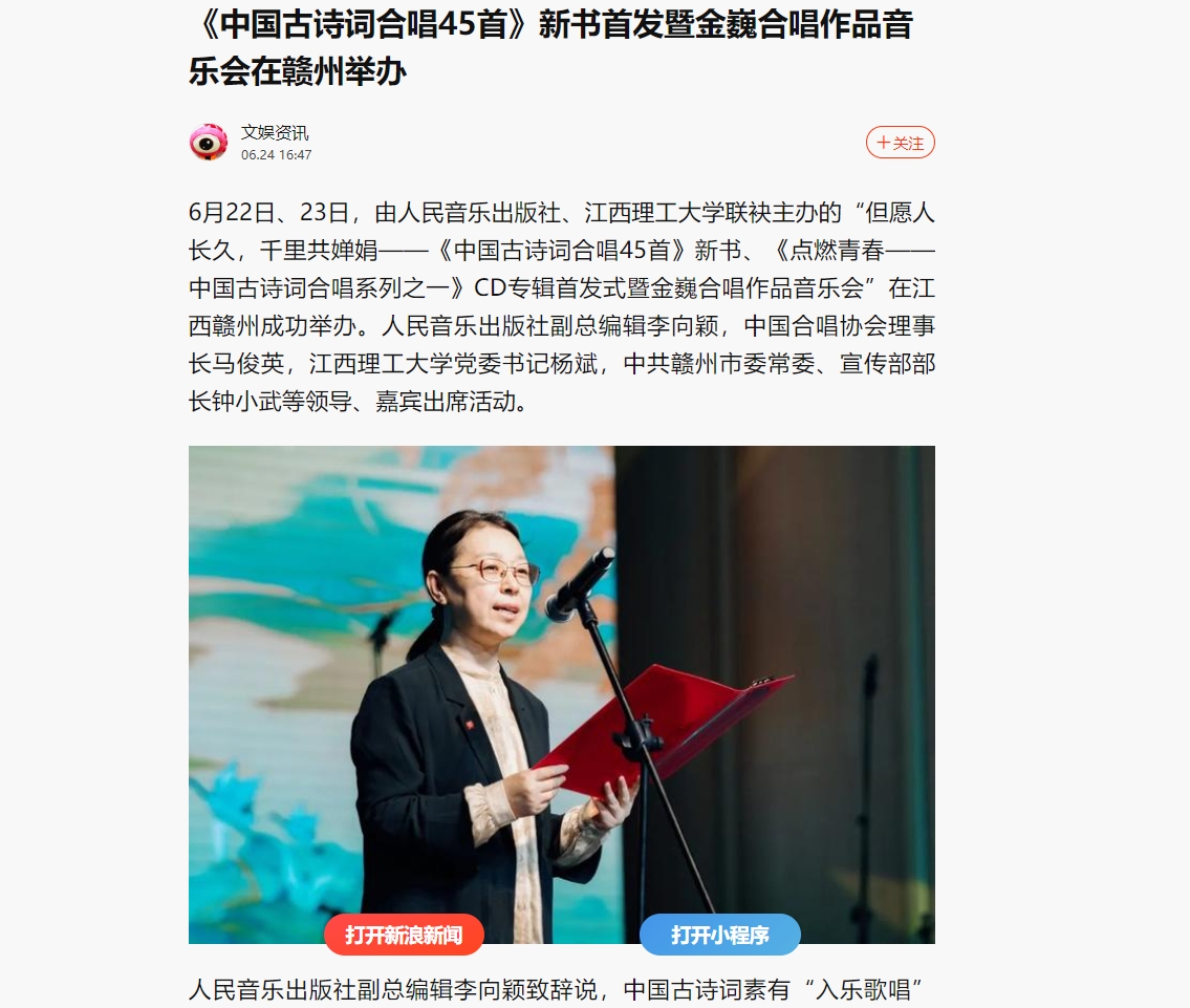 6月22日、23日,由人民音乐出版社、安博站官网登录入口,_安博(中国)联袂主办的“但愿人长久,千里共婵娟——《中国古诗词合唱45首》新书、《点燃青春——中国古诗词合唱系列之一》CD专辑首发式暨金巍合唱作品音乐会”在江西赣州成功举办。人民音乐出版社副总编辑李向颖,中国合唱协会理事长马俊英,安博站官网登录入口,_安博(中国)党委书记杨斌,中共赣州市委常委、宣传部部长钟小武等领导、嘉宾出席活动。