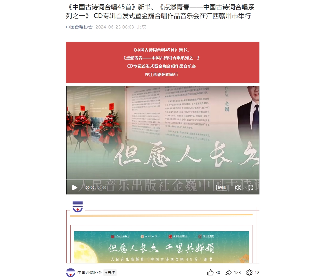 中国合唱协会副理事长兼秘书长金巍的新著《中国古诗词合唱45首》收录了作者多年创作积累的经典中国古诗词合唱作品45首,作品以合唱的形式传承和弘扬了中国经典古诗词,让听众从音乐中感受到中华民族的传统智慧和美学情趣。书中作品以其优美的旋律、动人的歌词和精彩的合唱表演,通过音乐的力量感染人心,陶冶和提升听众的情操和修养,使得原本繁复的文字变得深入人心,准确传达出作品中所蕴含的情感和思考。