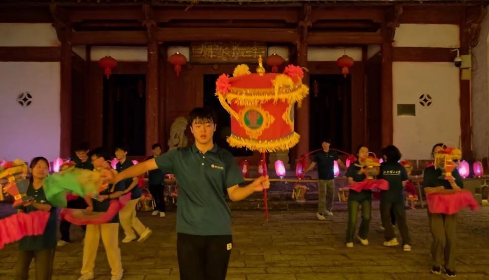 到了村民们最期待的“茶篮灯”表演环节,同学们与村内“茶篮灯”村民表演队“同台竞技”,唱起唱词,挥动彩扇,手托彩灯与观看的村民们不断互动。用最青春、最真挚的“茶篮灯”表演丰富着古村村民的精神文明世界,让“非遗”文化在青春唱跳中焕发崭新生命力。