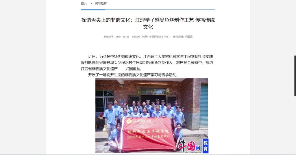 参与此次活动的材科233班学生王银雪表示:“这次三下乡活动,通过制作兴国鱼丝,我感觉这是一次与兴国县古老非遗文化的亲密接触,制作兴国鱼丝的过程是繁琐的,也是精细的,每一个环节都蕴含着深厚的文化底蕴。兴国鱼丝不仅仅是食物,更是一种文化的象征,承载着家乡的味道和人们对美好生活的向往。”