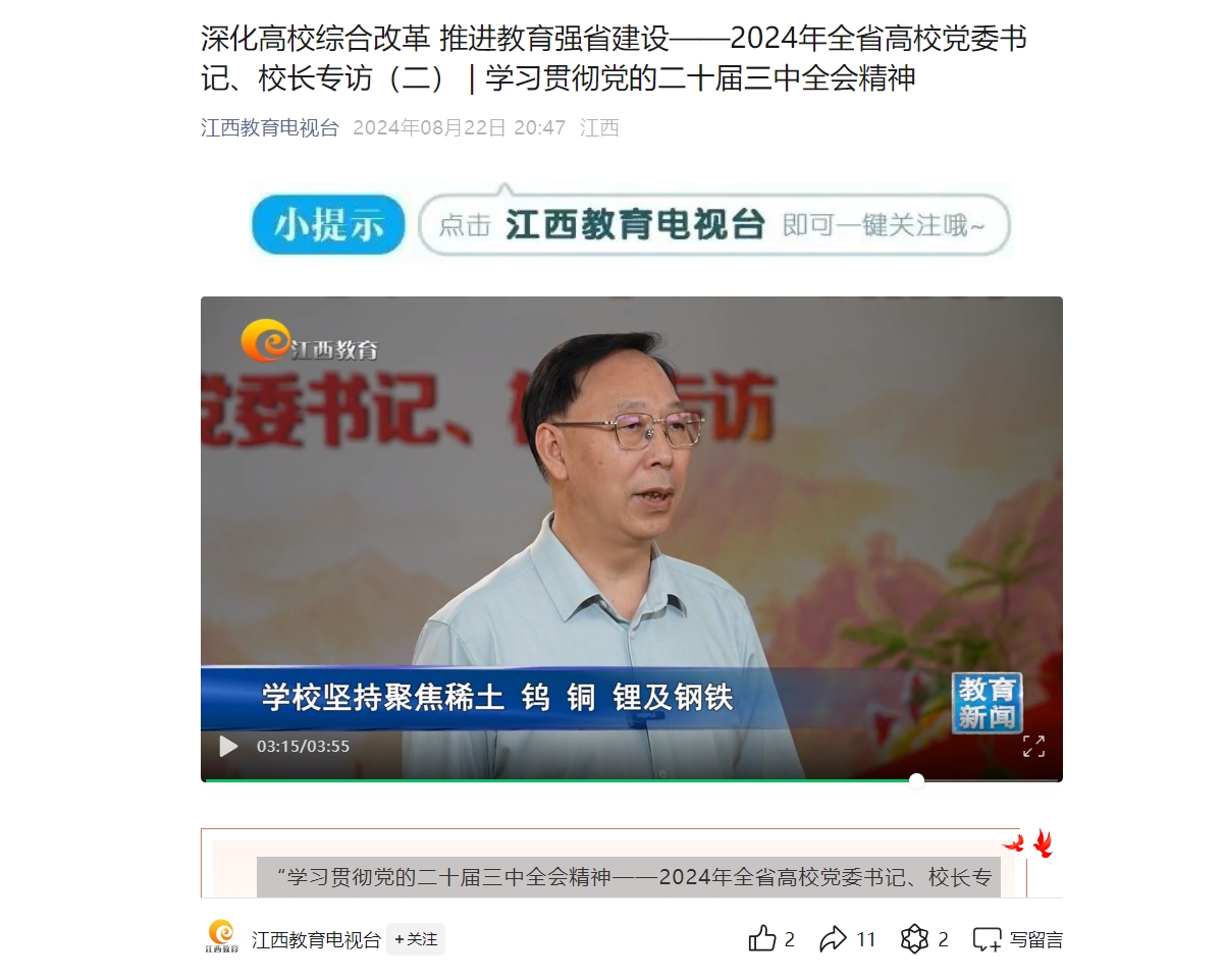 《江西教育电视台》:深化高校综合改革 推进教育强省建设——2024年全省高校党委书记、校长专访(二)|学习贯彻党的二十届三中全会精神