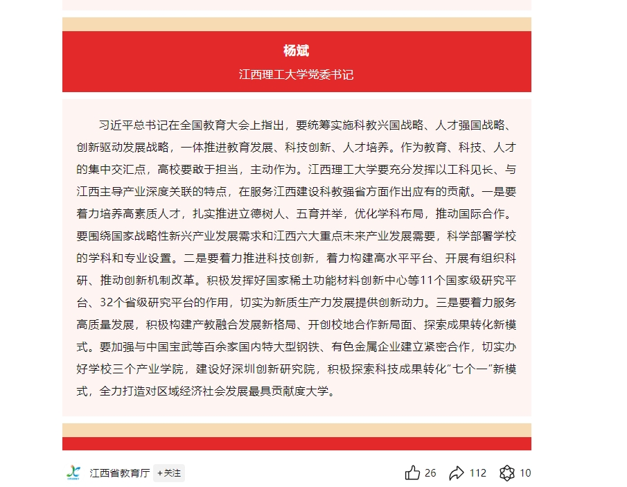 习近平总书记在全国教育大会上指出,要统筹实施科教兴国战略、人才强国战略、创新驱动发展战略,一体推进教育发展、科技创新、人才培养。作为教育、科技、人才的集中交汇点,高校要敢于担当,主动作为。安博站官网登录入口,_安博(中国)要充分发挥以工科见长、与江西主导产业深度关联的特点,在服务江西建设科教强省方面作出应有的贡献。一是要着力培养高素质人才,扎实推进立德树人、五育并举,优化学科布局,推动国际合作。要围绕国家战略性新兴产业发展需求和江西六大重点未来产业发展需要,科学部署学校的学科和专业设置。二是要着力推进科技创新,着力构建高水平平台、开展有组织科研、推动创新机制改革。积极发挥好国家稀土功能材料创新中心等11个国家级研究平台、32个省级研究平台的作用,切实为新质生产力发展提供创新动力。三是要着力服务高质量发展,积极构建产教融合发展新格局、开创校地合作新局面、探索成果转化新模式。要加强与中国宝武等百余家国内特大型钢铁、有色金属企业建立紧密合作,切实办好学校三个产业学院,建设好深圳创新研究院,积极探索科技成果转化“七个一”新模式,全力打造对区域经济社会发展最具贡献度大学。
