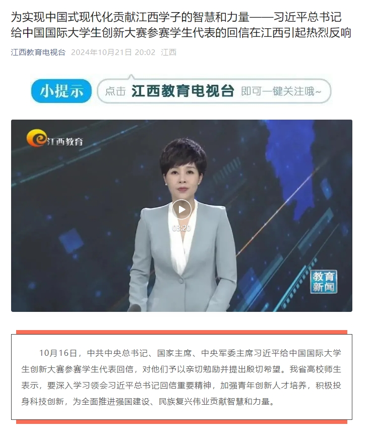 《江西教育电视台》:为实现中国式现代化贡献江西学子的智慧和力量——习近平总书记给中国国际大学生创新大赛参赛学生代表的回信在江西引起热烈反响