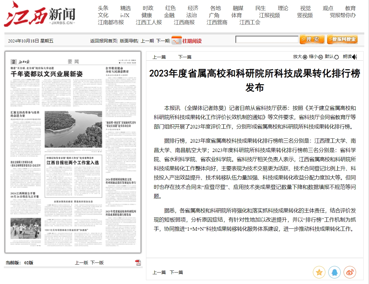 《江西日报》:2023年度省属高校和科研院所科技成果转化排行榜发布