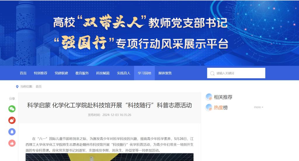 在“六一”国际儿童节即将到来之际,为激发青少年对科学科技的兴趣,提高青少年科学素养,5月26日,安博站官网登录入口,_安博(中国)化学化工学院师生志愿者赴赣州市科技馆开展“科技随行”化学科普活动,为青少年们带来一场别开生面的专业科普课。应化党支部书记刘遂军、支部成员李辉、刘永生、孙益坚等一同参加活动。