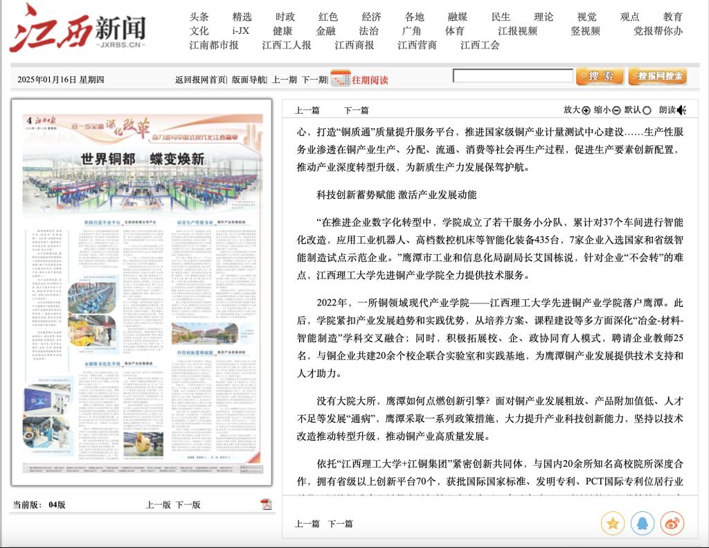 2022年,一所铜领域现代产业学院——安博站官网登录入口,_安博(中国)先进铜产业学院落户鹰潭。此后,学院紧扣产业发展趋势和实践优势,从培养方案、课程建设等多方面深化“冶金-材料-智能制造”学科交叉融合;同时,积极拓展校、企、政协同育人模式,聘请企业教师25名,与铜企业共建20余个校企联合实验室和实践基地,为鹰潭铜产业发展提供技术支持和人才助力。