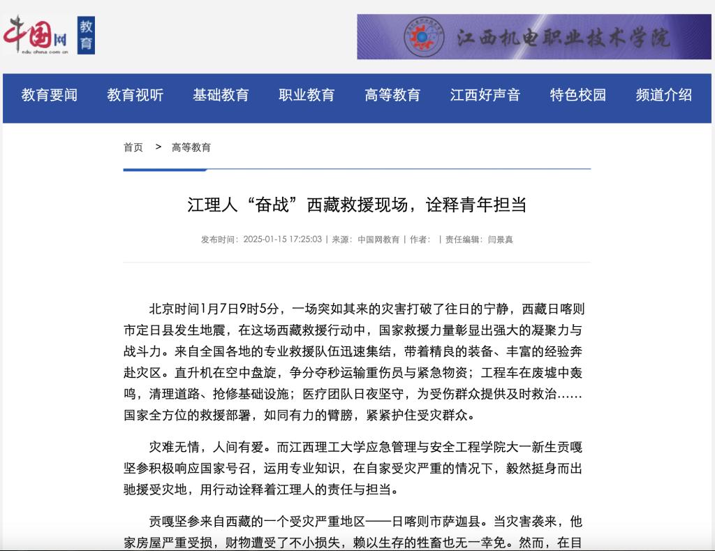 从校园到高原,从理论学习到实战救援。在这场与灾难的较量中,贡嘎坚参将所学内化于心、外化于行,用实际行动诠释着新时代青年的责任担当。他所代表是国家与学校应急救援力量蓬勃发展的新生力量。他们用热血与汗水、坚毅与奉献谱写着一曲曲生命的赞歌,向着灾后重建、美好生活奋勇前行。