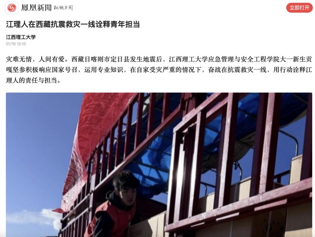 《凤凰新闻》:江理人在西藏抗震救灾一线诠释青年担当