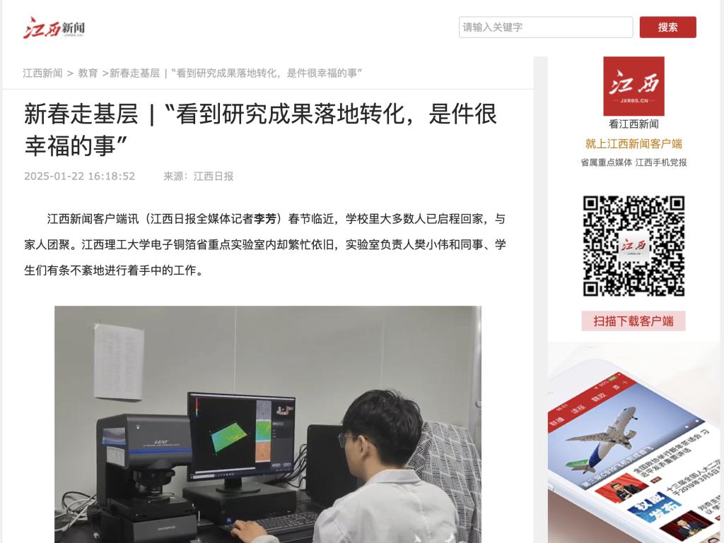 “虽然寒假还在忙科研,但是研究成果能落地转化,是件很幸福的事。”樊小伟介绍道,眼下,实验室正在与江铜铜箔公司继续深化产学研合作,聚力攻关2024年江西省重大科技成果熟化与工程化研究项目——高性能5G通信用低轮廓电子铜箔研制及中试应用,在现有技术基础上,开展技术深化,实现5G铜箔市场新应用。