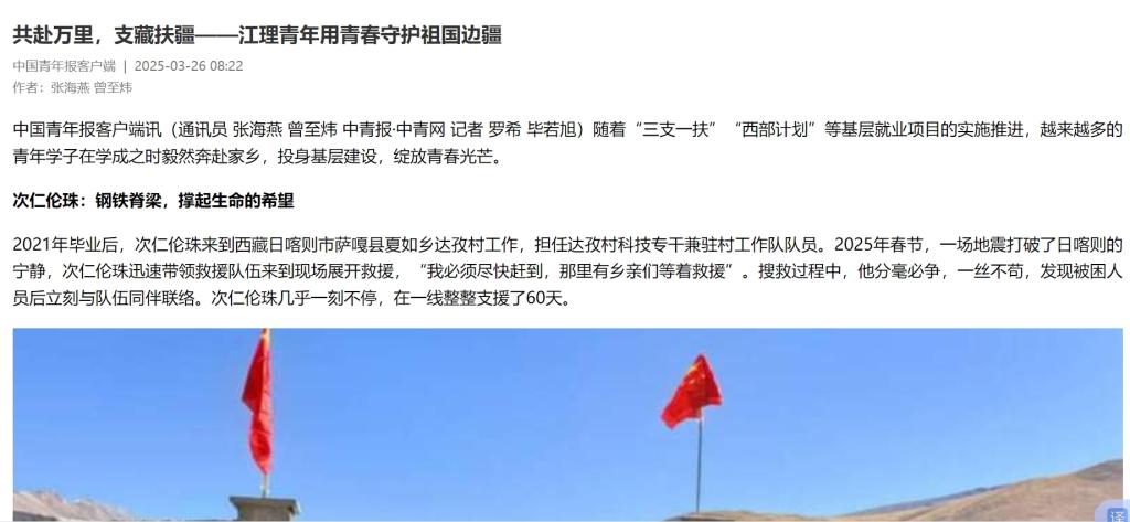 2021年毕业后,次仁伦珠来到西藏日喀则市萨嘎县夏如乡达孜村工作,担任达孜村科技专干兼驻村工作队队员。2025年春节,一场地震打破了日喀则的宁静,次仁伦珠迅速带领救援队伍来到现场展开救援,“我必须尽快赶到,那里有乡亲们等着救援”。搜救过程中,他分毫必争,一丝不苟,发现被困人员后立刻与队伍同伴联络。次仁伦珠几乎一刻不停,在一线整整支援了60天。