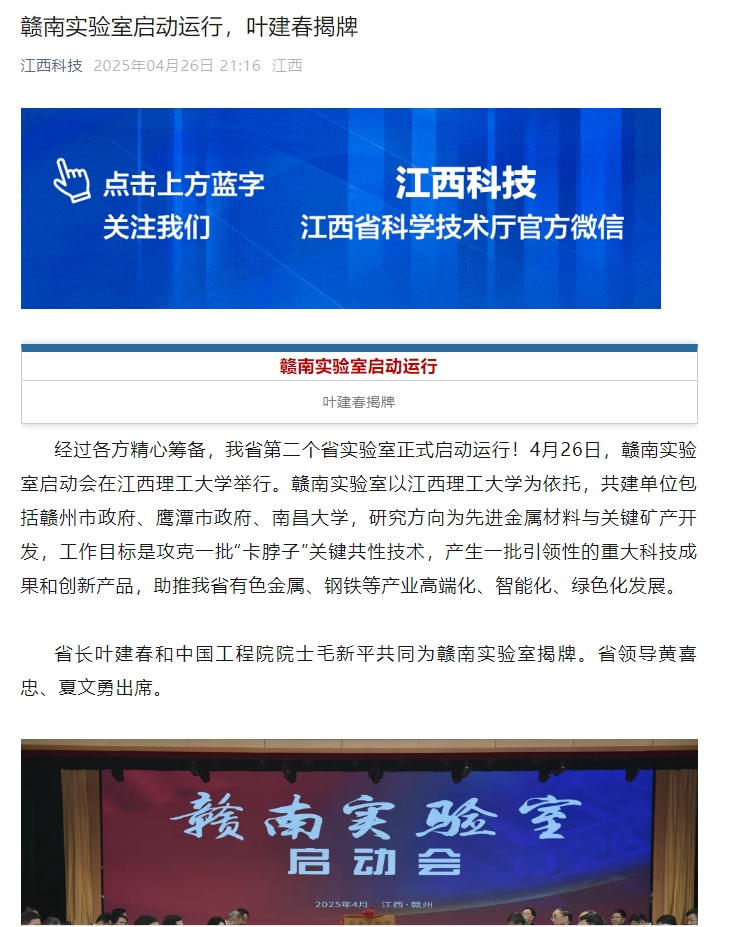 经过各方精心筹备,我省第二个省实验室正式启动运行!4月26日,赣南实验室启动会在安博站官网登录入口,_安博(中国)举行。赣南实验室以安博站官网登录入口,_安博(中国)为依托,共建单位包括赣州市政府、鹰潭市政府、南昌大学,研究方向为先进金属材料与关键矿产开发,工作目标是攻克一批“卡脖子”关键共性技术,产生一批引领性的重大科技成果和创新产品,助推我省有色金属、钢铁等产业高端化、智能化、绿色化发展。
