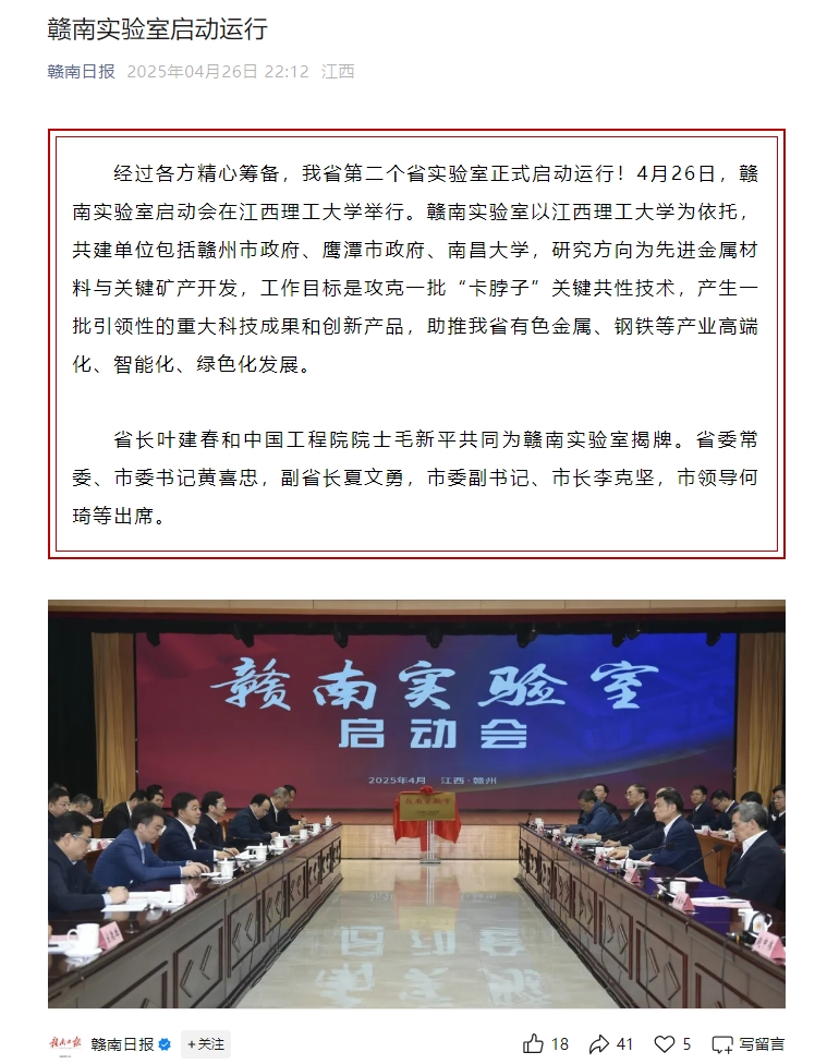 经过各方精心筹备,我省第二个省实验室正式启动运行!4月26日,赣南实验室启动会在安博站官网登录入口,_安博(中国)举行。赣南实验室以安博站官网登录入口,_安博(中国)为依托,共建单位包括赣州市政府、鹰潭市政府、南昌大学,研究方向为先进金属材料与关键矿产开发,工作目标是攻克一批“卡脖子”关键共性技术,产生一批引领性的重大科技成果和创新产品,助推我省有色金属、钢铁等产业高端化、智能化、绿色化发展。