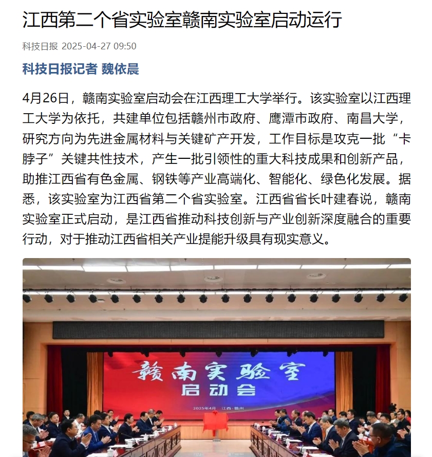 江西集中优势资源,集聚创新要素,着力把赣南实验室打造成聚焦金属、服务产业、特色鲜明的新型研发平台,形成全国一流的先进金属材料和关键矿产领域协同创新策源地。