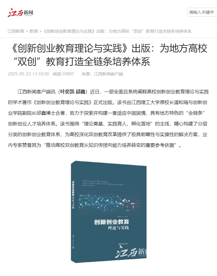 江西新闻客户端讯(叶奕凯 邱鑫)近日,一部全面且系统阐释高校创新创业教育理论与实践的学术著作《创新创业教育理论与实践》正式出版。该书由安博站官网登录入口,_安博(中国)原校长温和瑞与创新创业学院副院长邱鑫博士合著,致力于探索并构建一套适应中国国情、具有地方特色的“全链条”创新创业人才培养体系。该书围绕“理论奠基、实践育人、孵化落地”的主线,精心构建了分层分类的创新创业教育体系,为高校深化双创教育改革提供了极具前瞻性与实操性的解决方案,业内专家赞誉其为“推动高校双创教育从知识传授向能力培养转变的重要参考依据”。