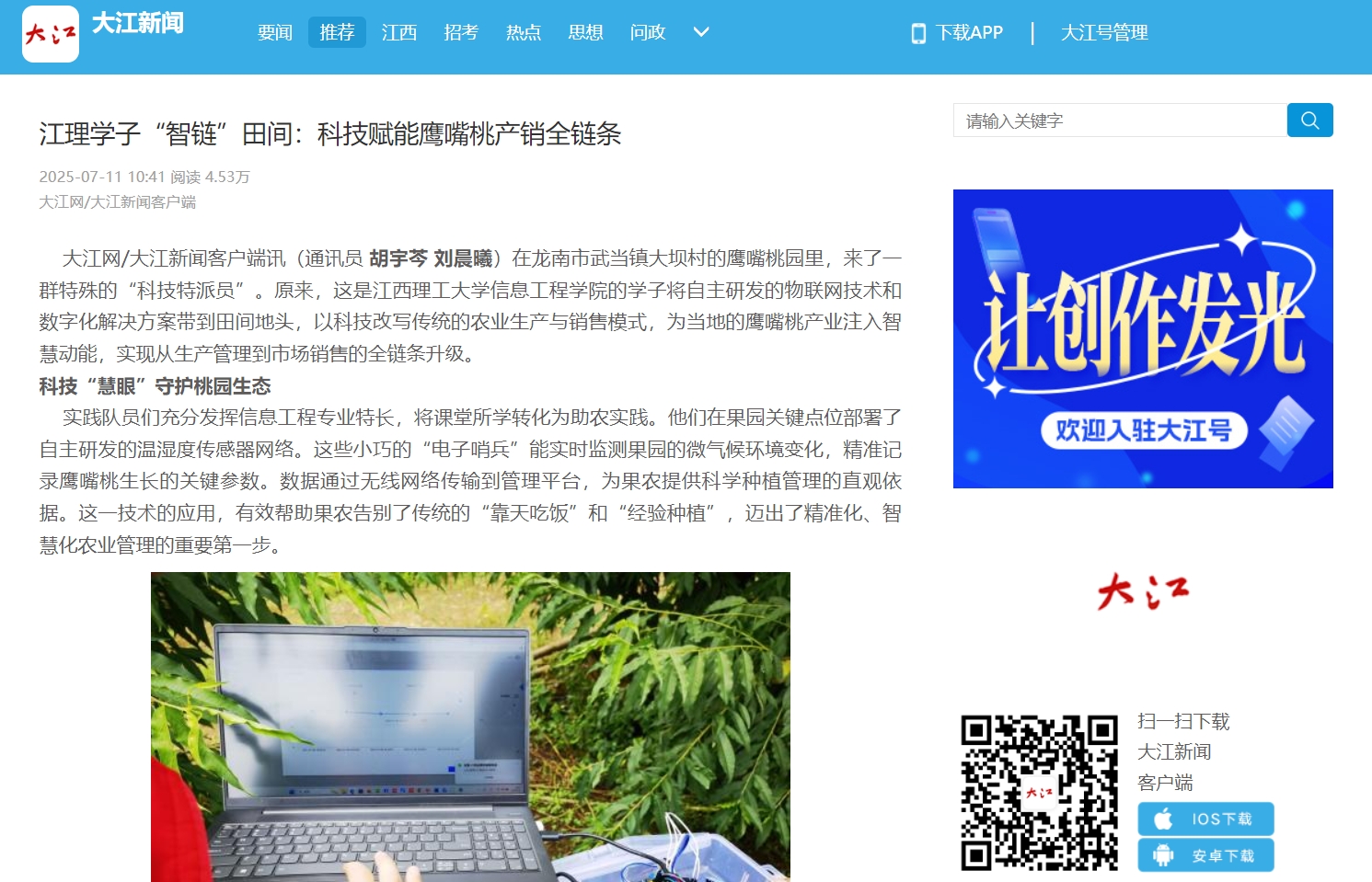 大江网/大江新闻客户端讯(通讯员胡宇芩 刘晨曦)在龙南市武当镇大坝村的鹰嘴桃园里,来了一群特殊的“科技特派员”。原来,这是安博站官网登录入口,_安博(中国)信息工程学院的学子将自主研发的物联网技术和数字化解决方案带到田间地头,以科技改写传统的农业生产与销售模式,为当地的鹰嘴桃产业注入智慧动能,实现从生产管理到市场销售的全链条升级。